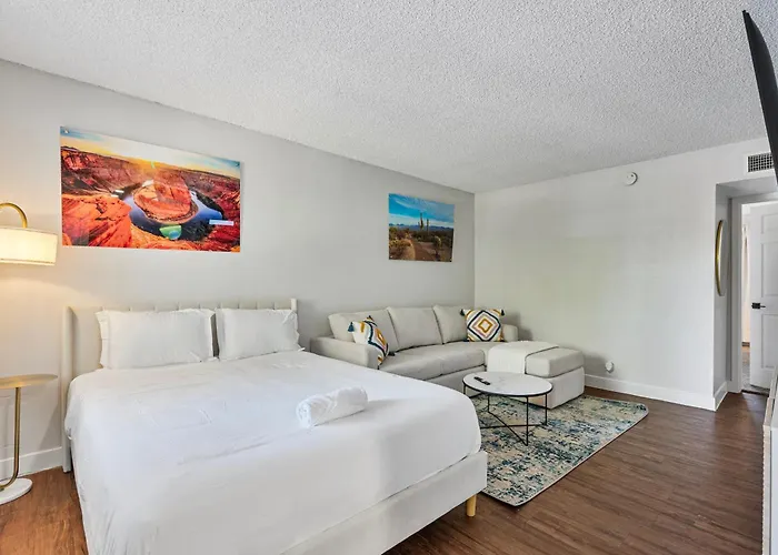 Dotato di servizi benessere quali una piscina coperta, quest'appartamento con 2 camere da letto, 2B1B Stylish Haven - Pool And Parking Tempe è situato a circa 25 minuti a piedi da Hall of Flame Museum of Firefighting. Gli ospiti possono raggiungere Mill Avenue District a una distanza di 2 km dall'appartamento.